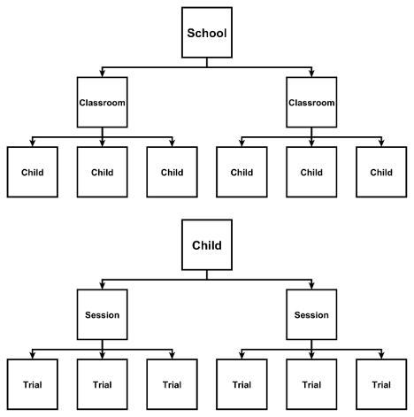 Hierarchical (nested) data structure: Illustration of three-level hierarchy (Level 3 = school/individual, Level 2 = classrooms/sessions, Level 1 = children/trials). In this illustration, each school (or individual) includes multiple classrooms (or sessions), and each classroom or session has multiple observations (children or trials). Such nesting means observations within a classroom are (probably) more alike than observations from different classrooms. Likewise, observations within a session are (probably) more alike than observations from different sessions.