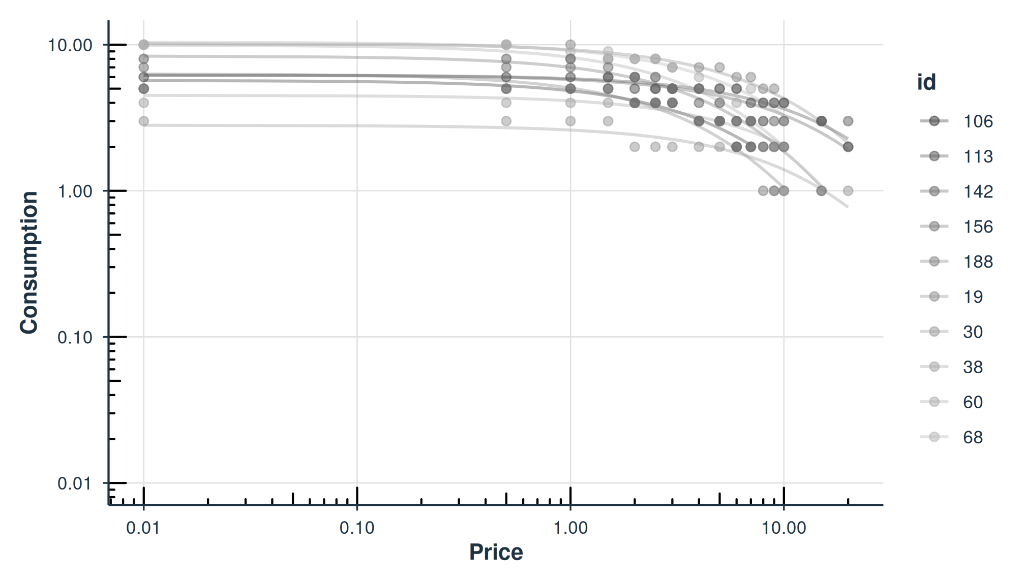 The first column contains the row number. The second column contains the id number of the series within the dataset. The third column contains the x values (in this specific dataset, price per drink) and the fourth column contains the associated responses (number of alcoholic drinks purchased at each respective price). There are replicates of id because for each series (or participant), several x values were presented.